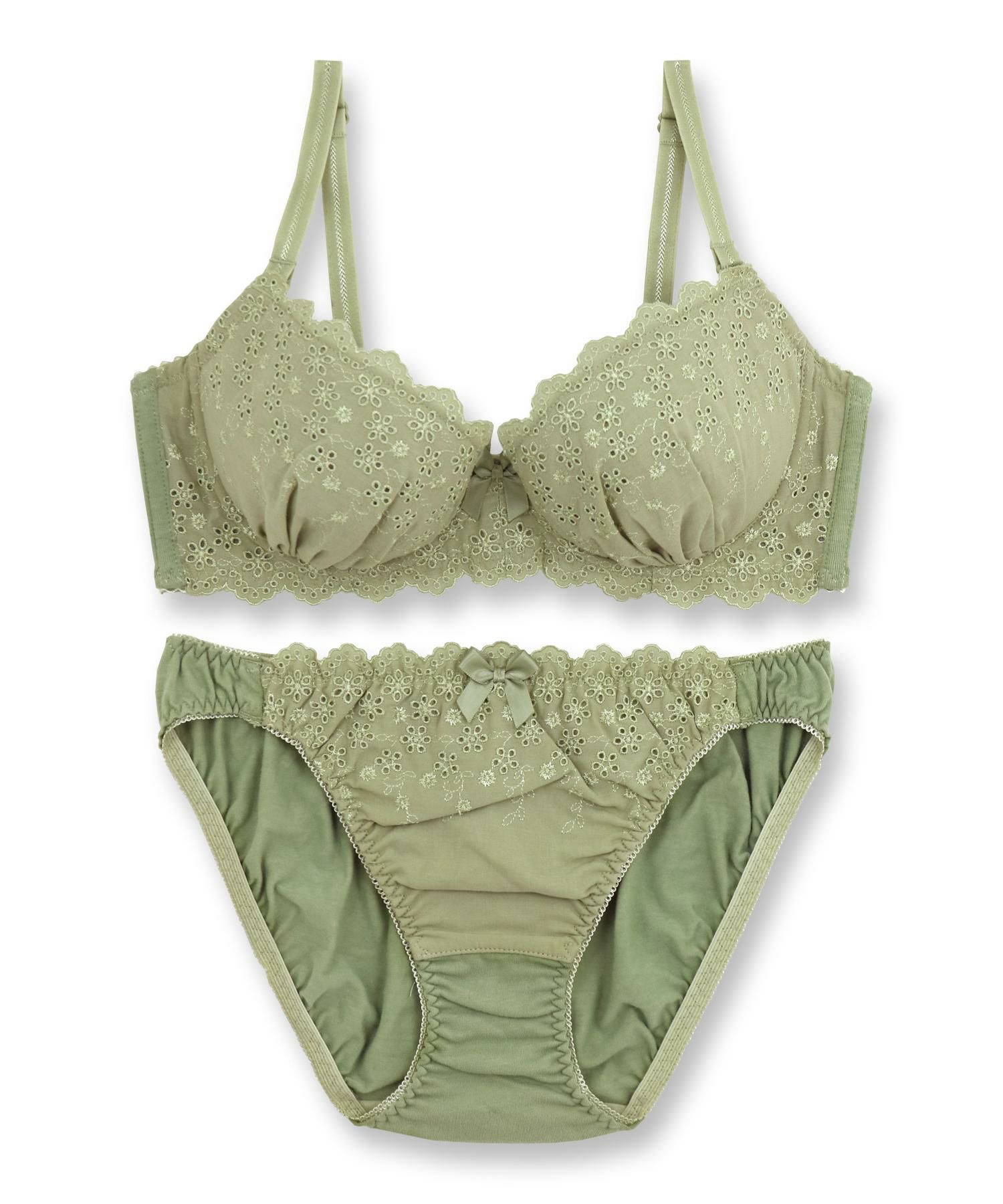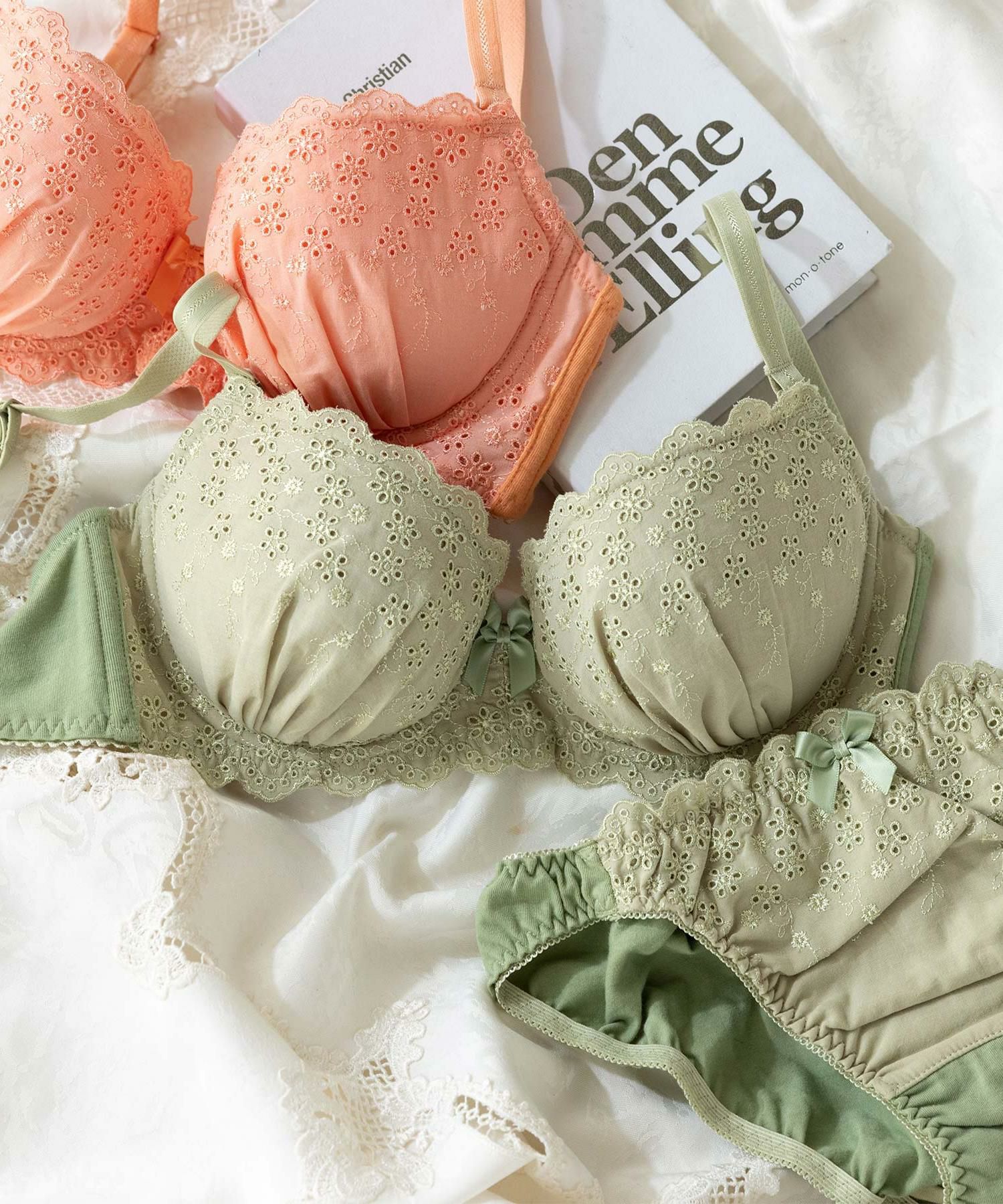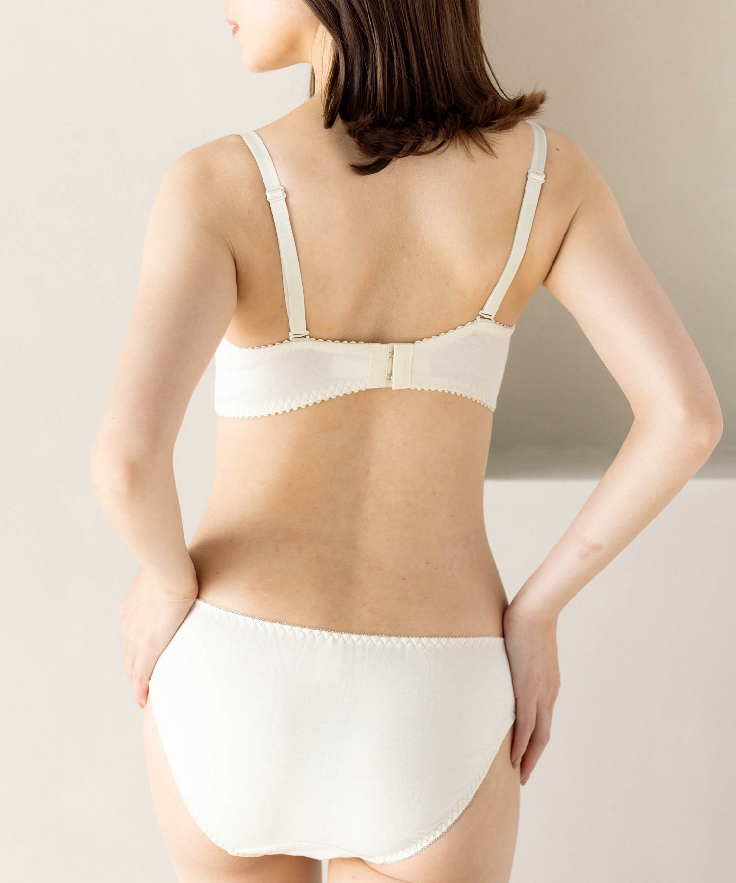 シンプル&ナチュラルなデザインにふわっと柔らかさを添えたコットンレースのデザイン。お肌のデリケートな部分に触れる、ブラのカップ裏やショーツのマチ裏は肌に優しい綿100%の天竺綿を使用しているのも人気の秘密。