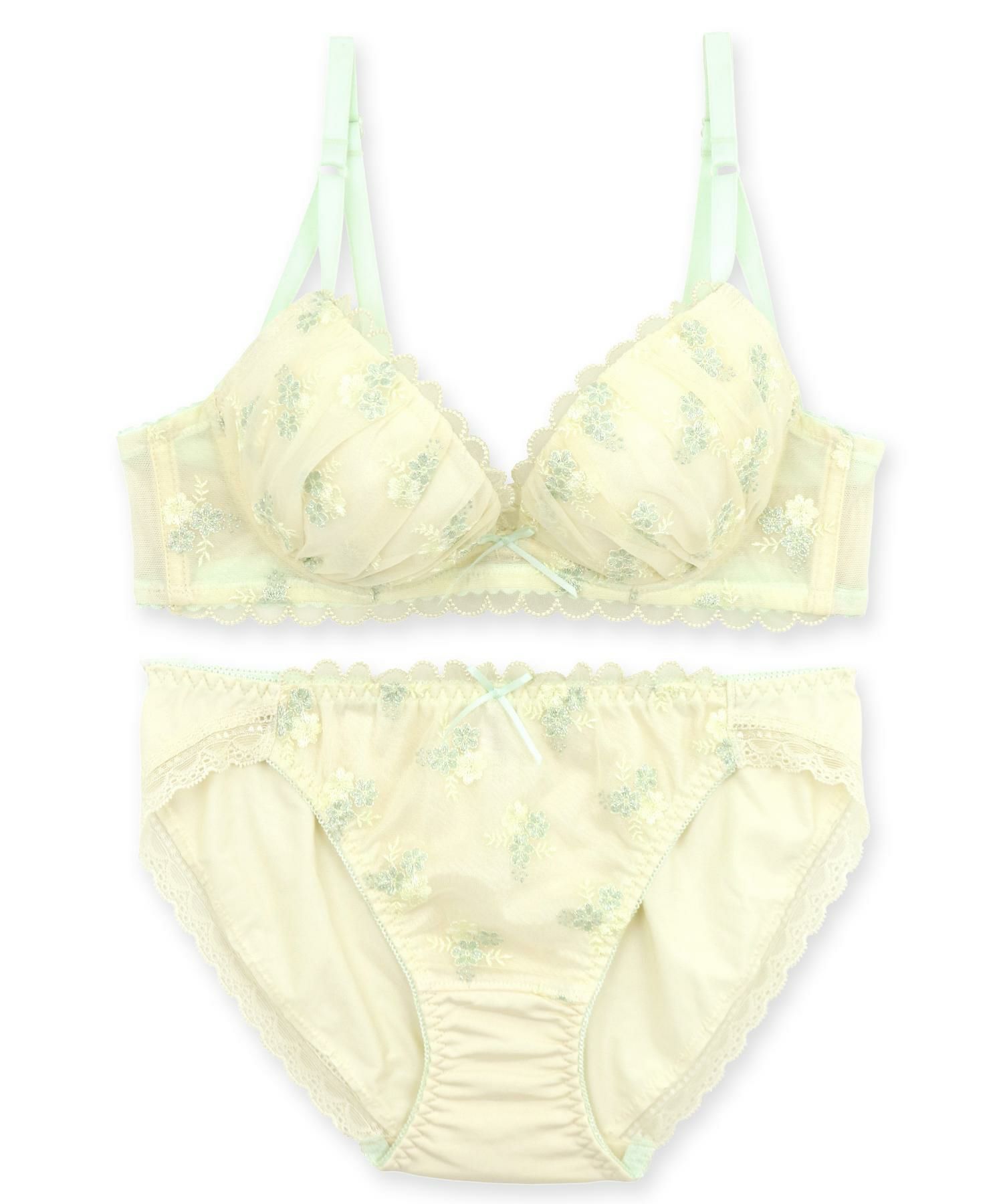 キラキラとやわらかくきらめく雪の結晶で作った小さな花束の刺繍、カップの上辺やアンダーに透けるスカラップレースを配置したフェミニンなデザイン。