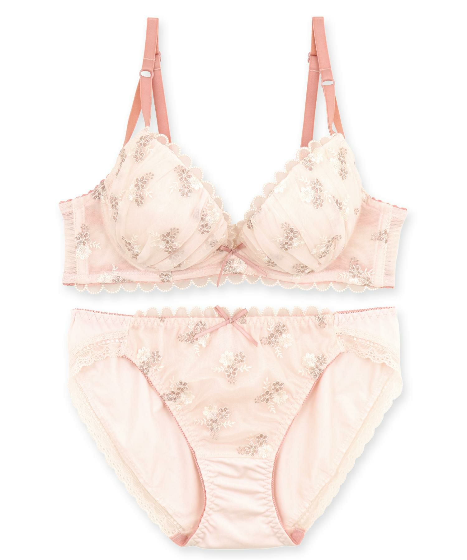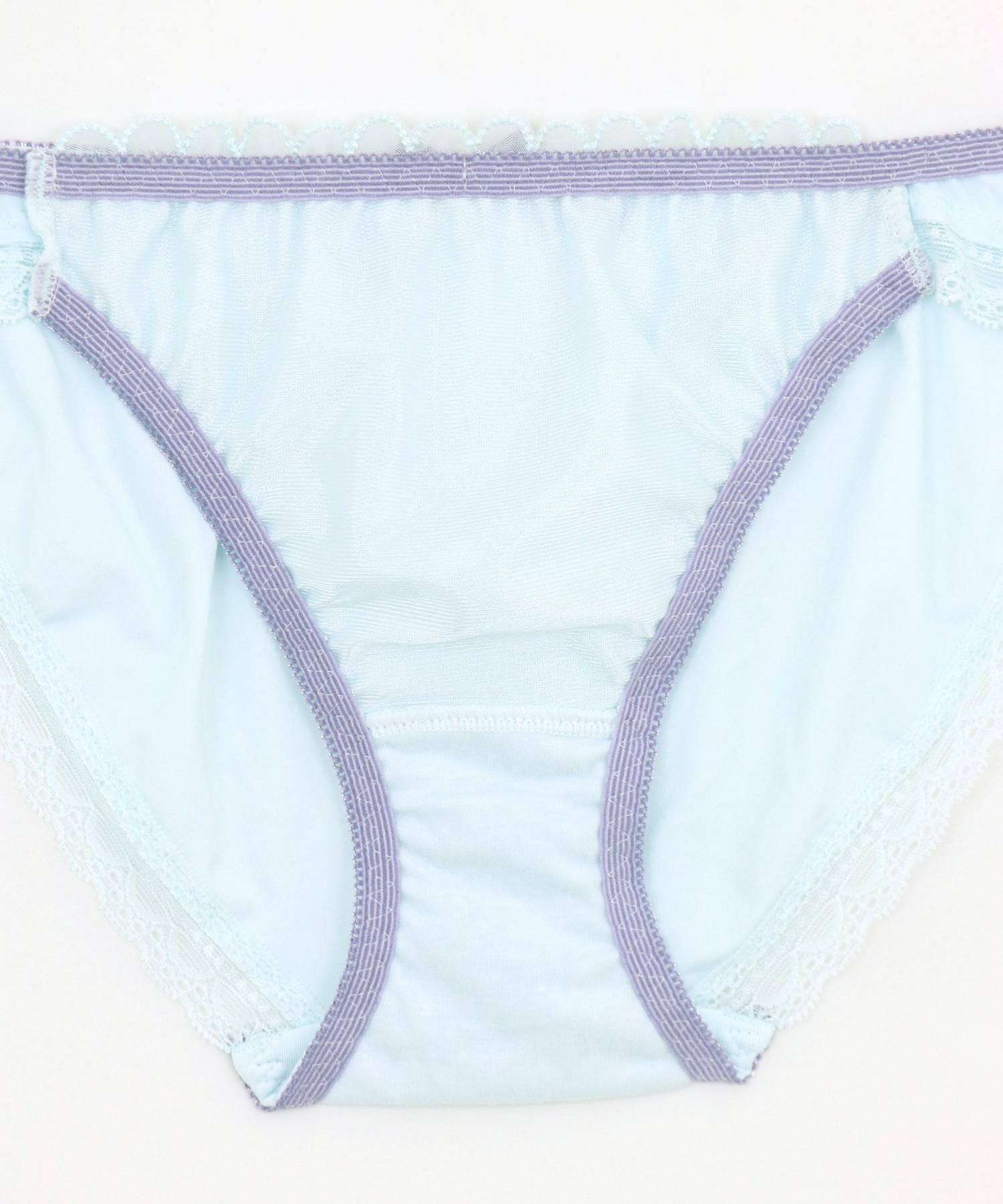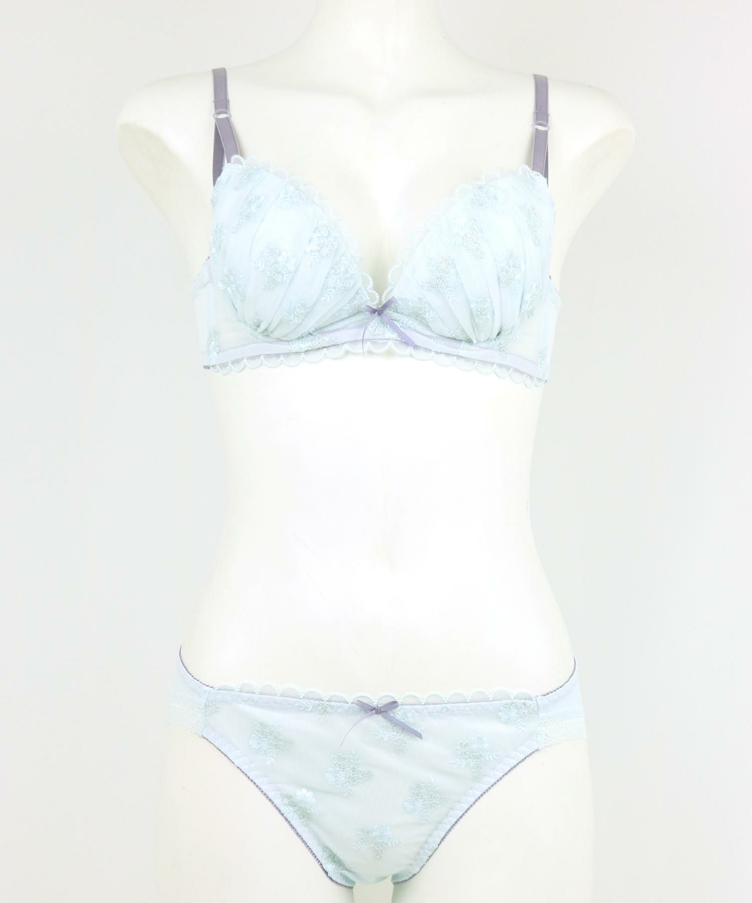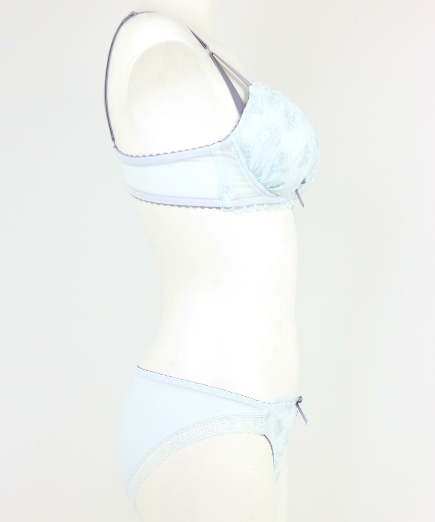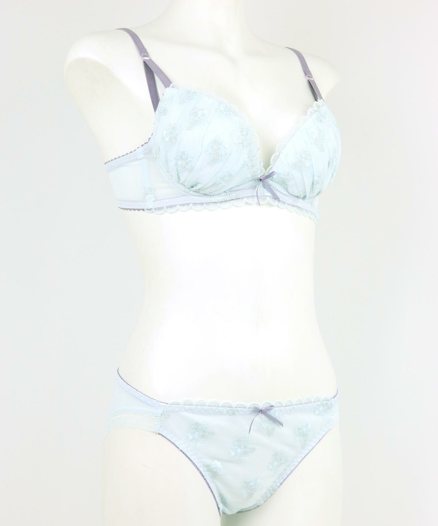 キラキラとやわらかくきらめく雪の結晶で作った小さな花束の刺繍、カップの上辺やアンダーに透けるスカラップレースを配置したフェミニンなデザイン。