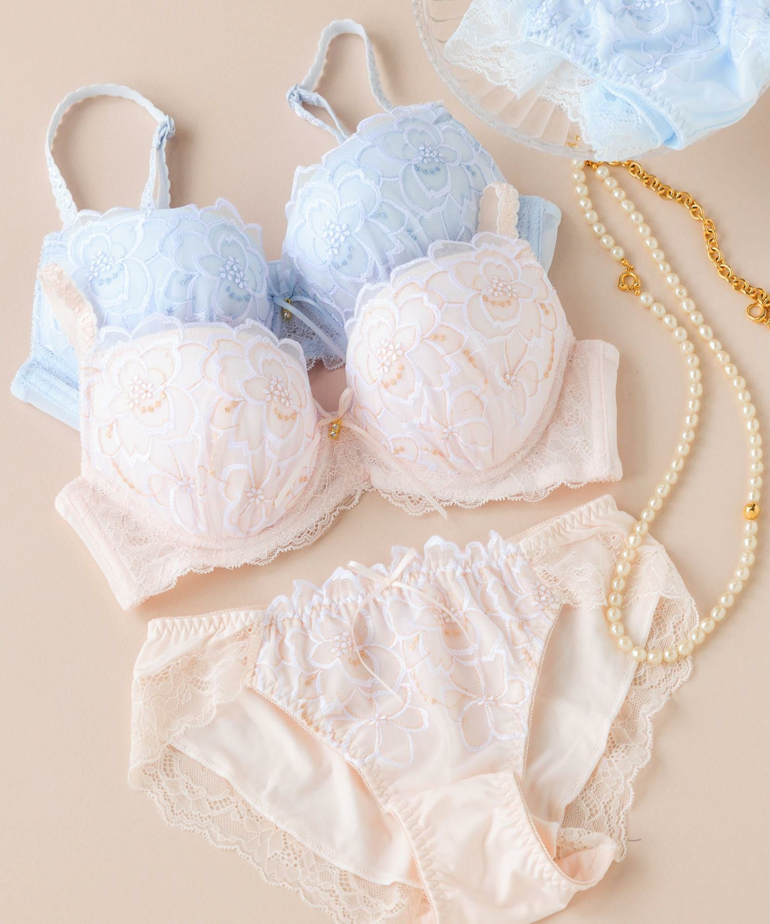 ラメ糸がきらめくフラワー刺繍レースが印象的なブラ&ショーツSET