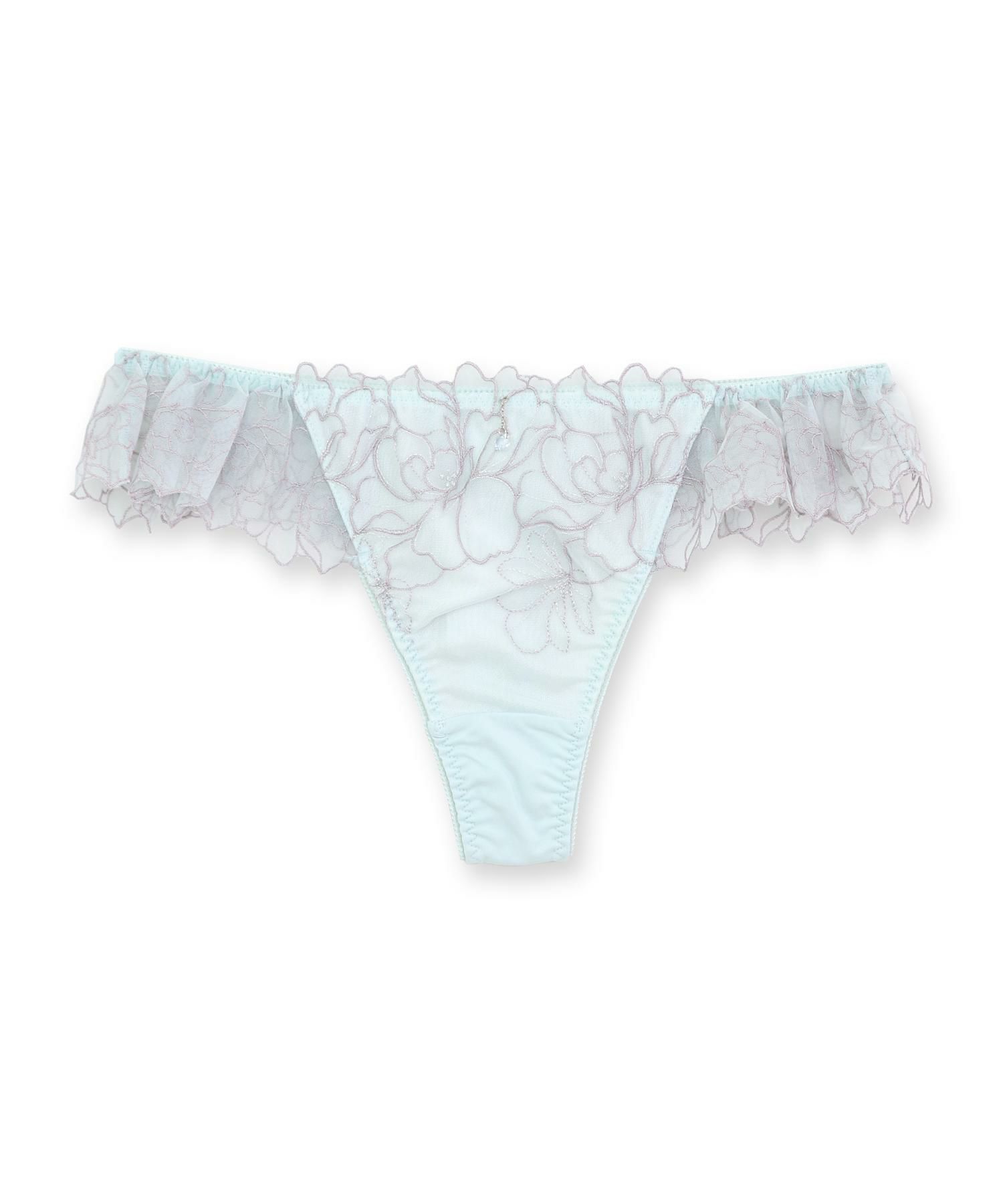 刺繍のチュールレースをたっぷり使ったフリルがウェストを一周するリュクスなデザインのTバックショーツ。ヒップラインを綺麗に見せるおしゃれアイテムの必需品。