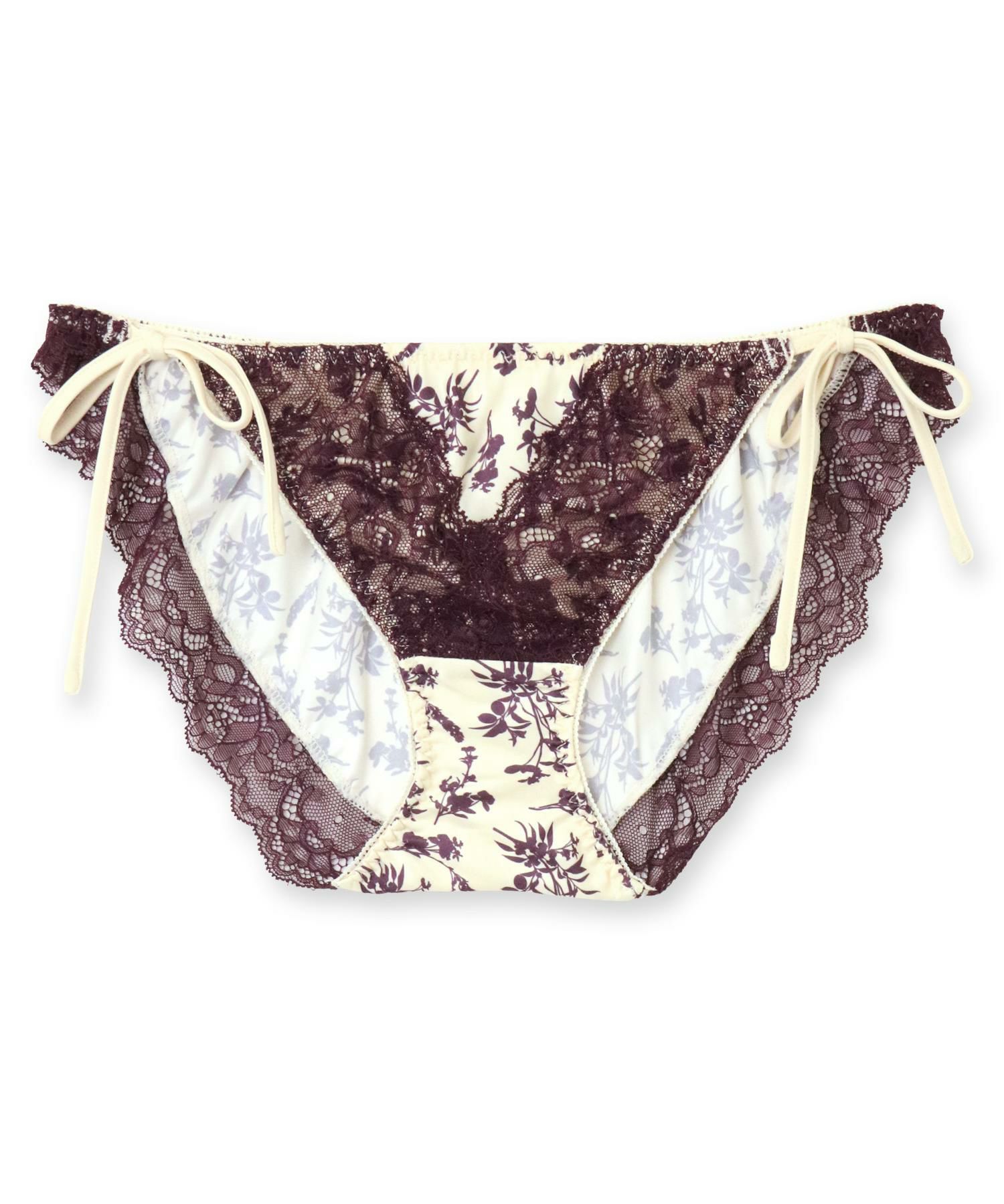 配色になった植物プリントにレースをオンしたパッと目をひくデザインのブラ&ショーツSETとお揃いの紐ショーツ。お揃いにしても単品でも可愛い華あり配色プリントの後ろ身頃が可愛い紐ショーツ。肌のデリケートな部分に当たるショーツのマチ裏はコットン100%の綿天竺を使用しています。