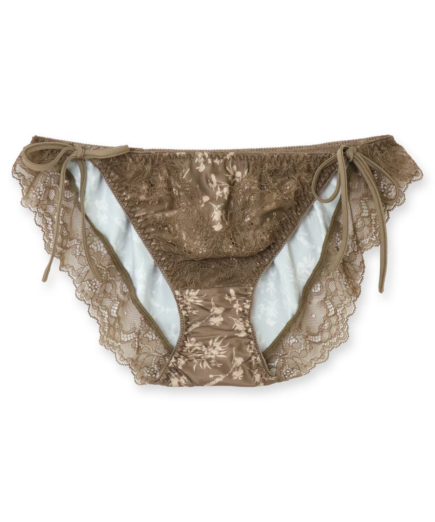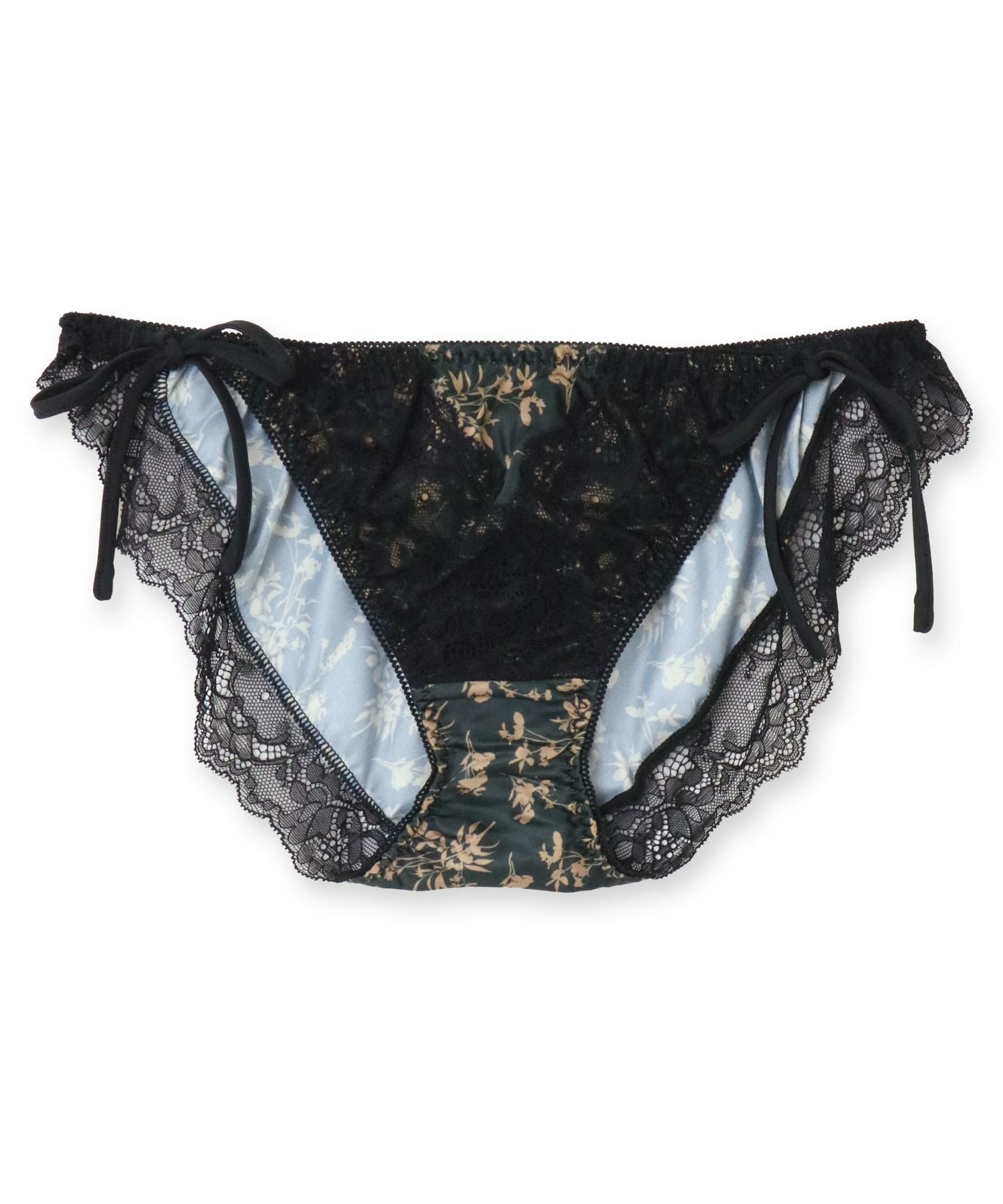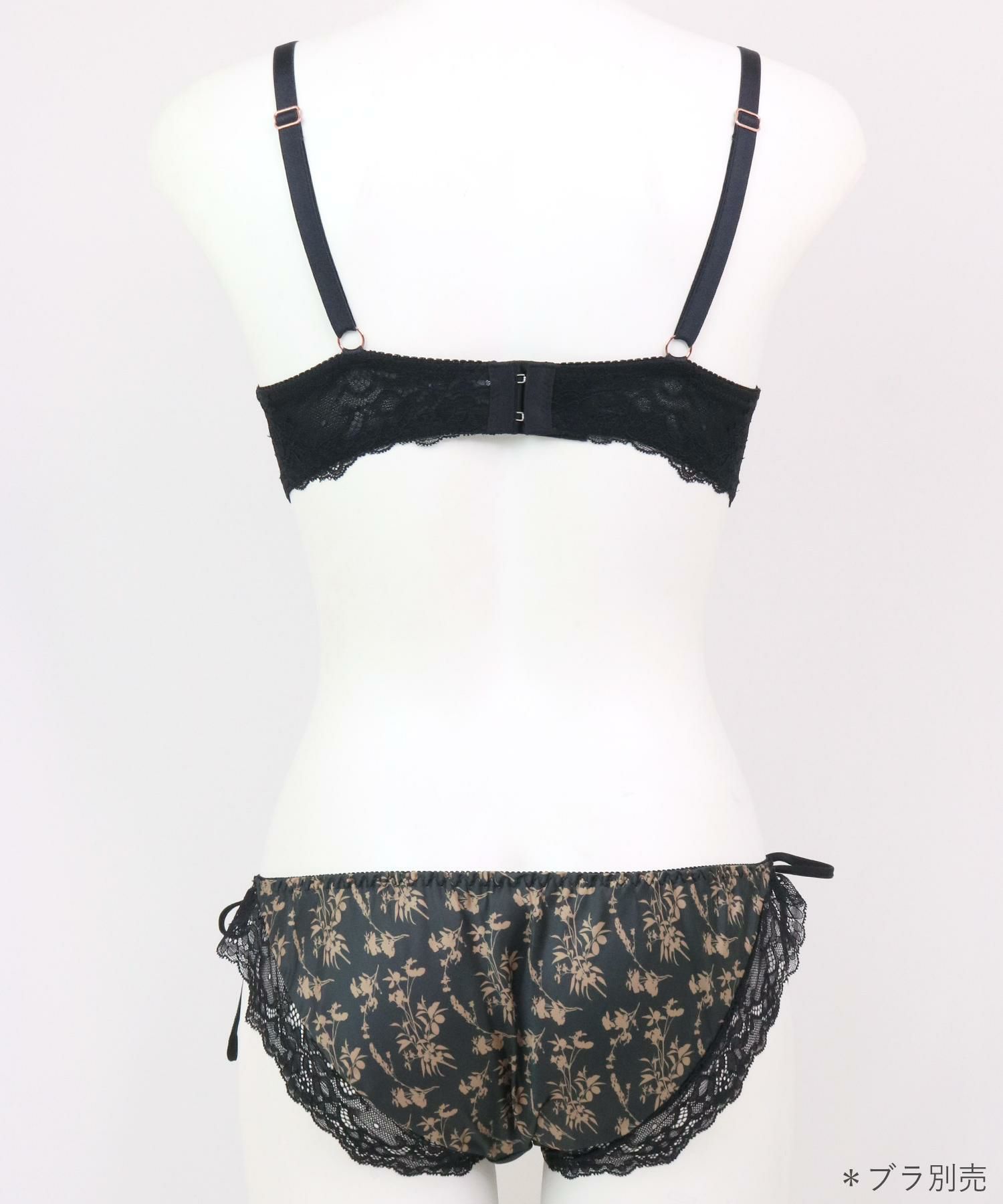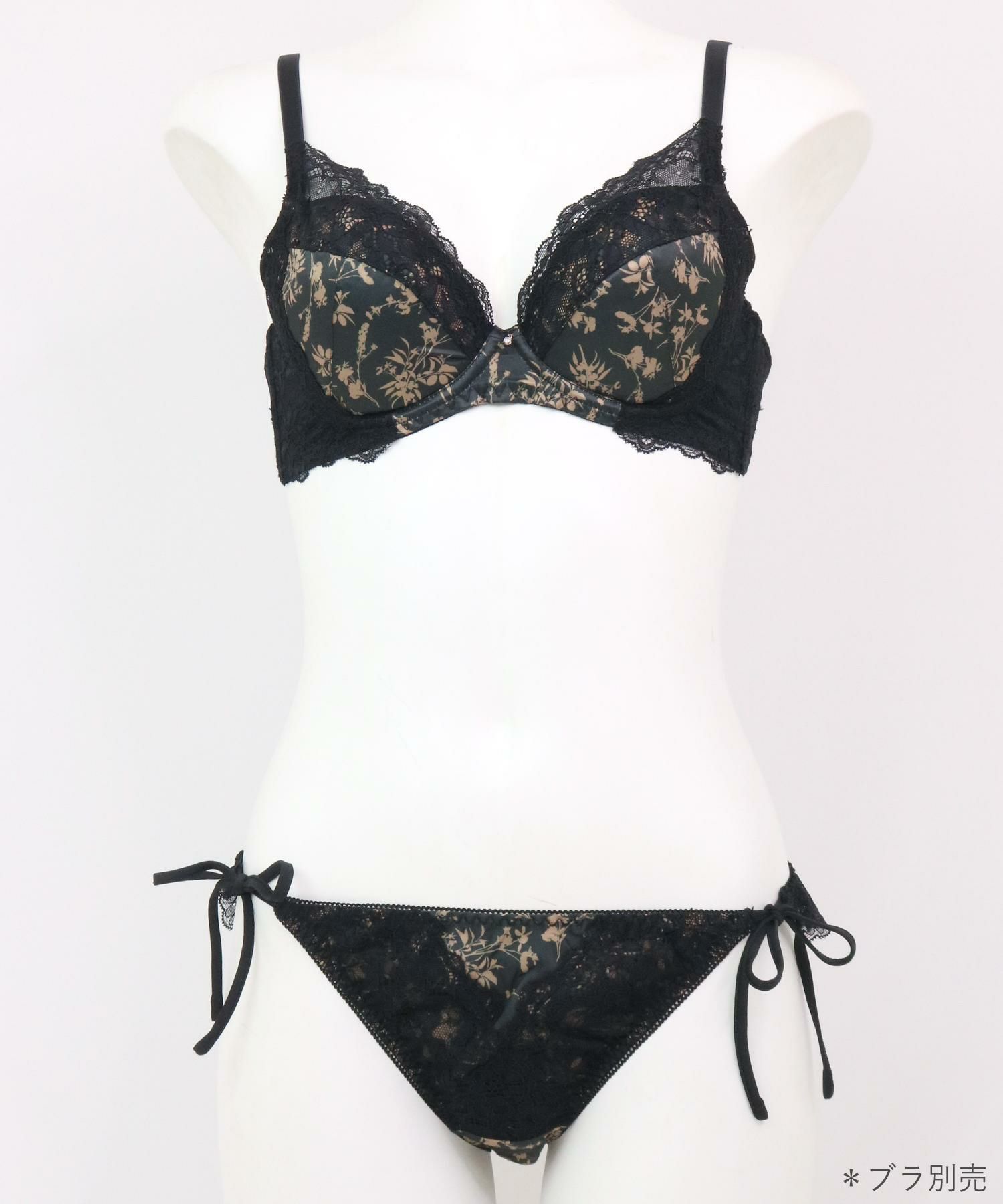 配色になった植物プリントにレースをオンしたパッと目をひくデザインのブラ&ショーツSETとお揃いの紐ショーツ。お揃いにしても単品でも可愛い華あり配色プリントの後ろ身頃が可愛い紐ショーツ。肌のデリケートな部分に当たるショーツのマチ裏はコットン100%の綿天竺を使用しています。