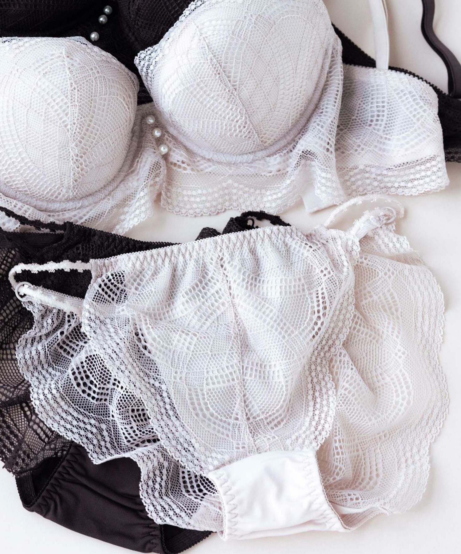 シンプルな総レースデザインですが、直線的でカジュアルな雰囲気のレースを使用しているので可愛くなりすぎず、大人っぽく着られます。