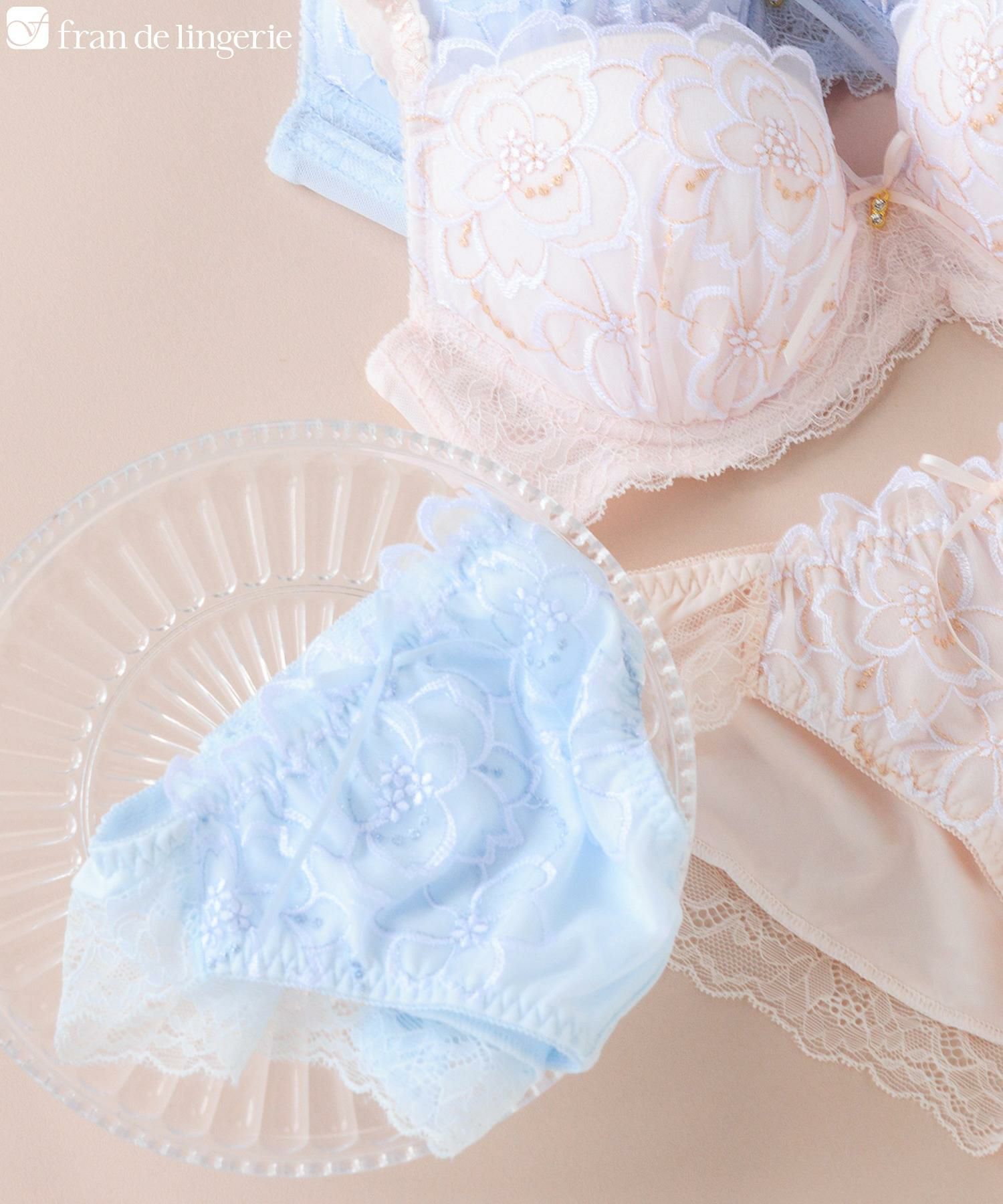 ラメ糸がきらめくフラワー刺繍レースが印象的なブラ&ショーツSETとお揃いの紐ショーツ