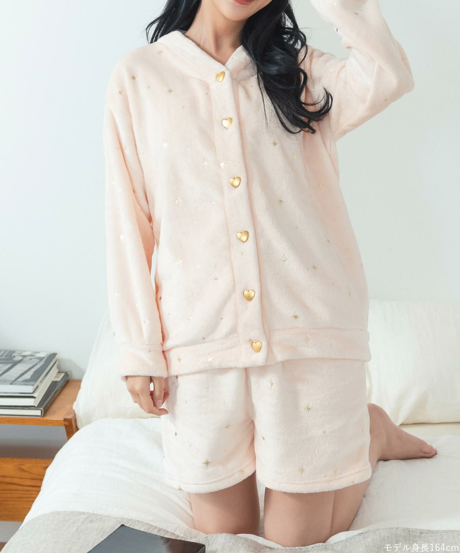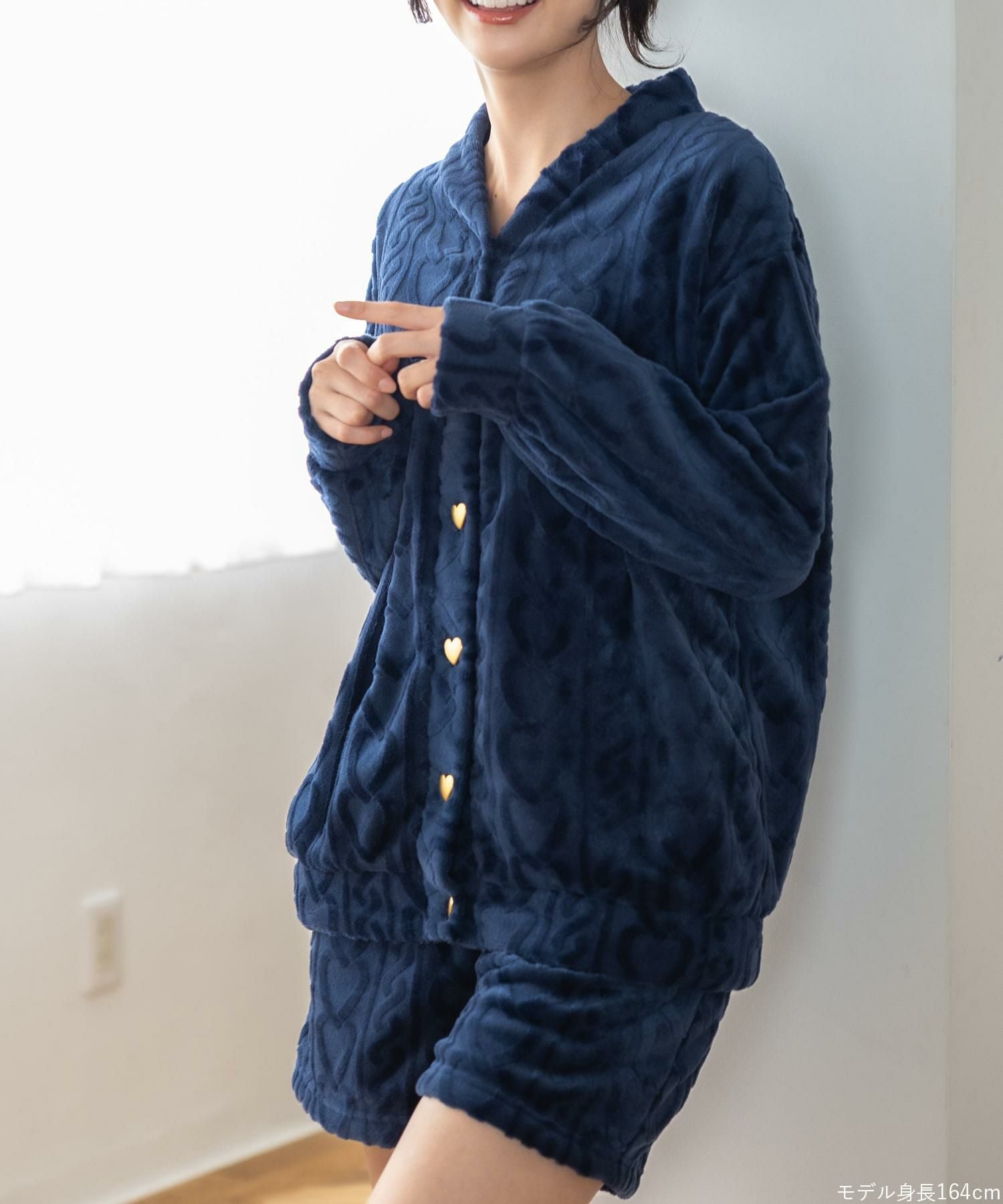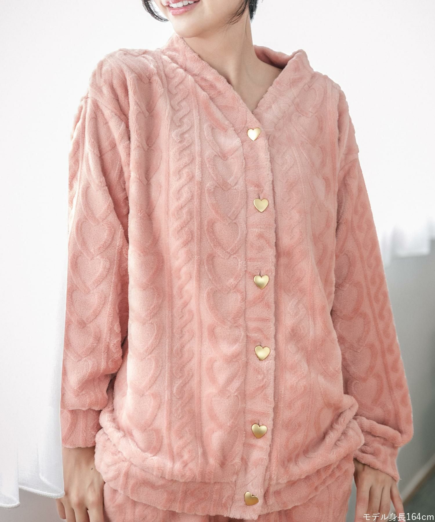 ハートのボタンやきゅっと絞られた袖口がキュートなカーディガンとショートパンツのセットアップ。もこもこのあったかソックスや、ロング丈の着圧タイプのソックスやレギンスなどとコーディネートが楽しめるデザイン。ボトムスは便利なポケットが付いています。