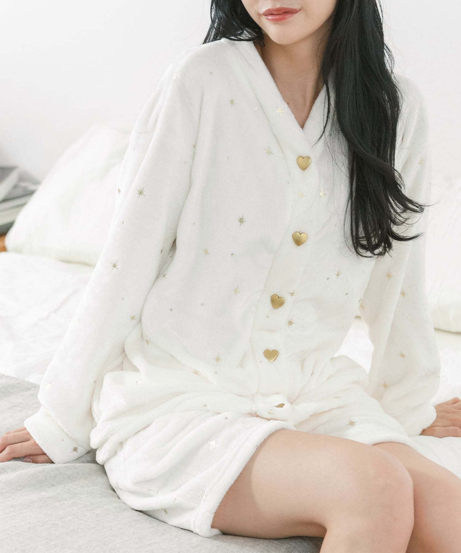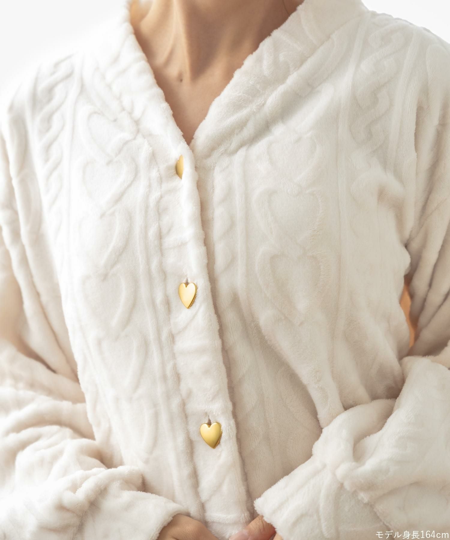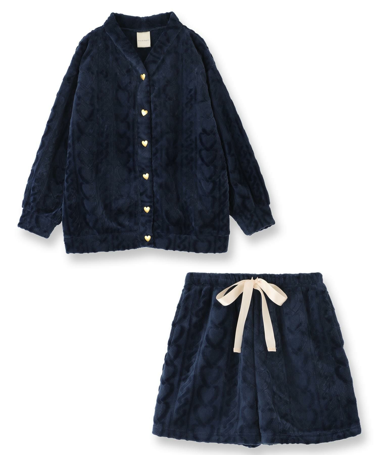 ハートのボタンやきゅっと絞られた袖口がキュートなカーディガンとショートパンツのセットアップ。もこもこのあったかソックスや、ロング丈の着圧タイプのソックスやレギンスなどとコーディネートが楽しめるデザイン。ボトムスは便利なポケットが付いています。
