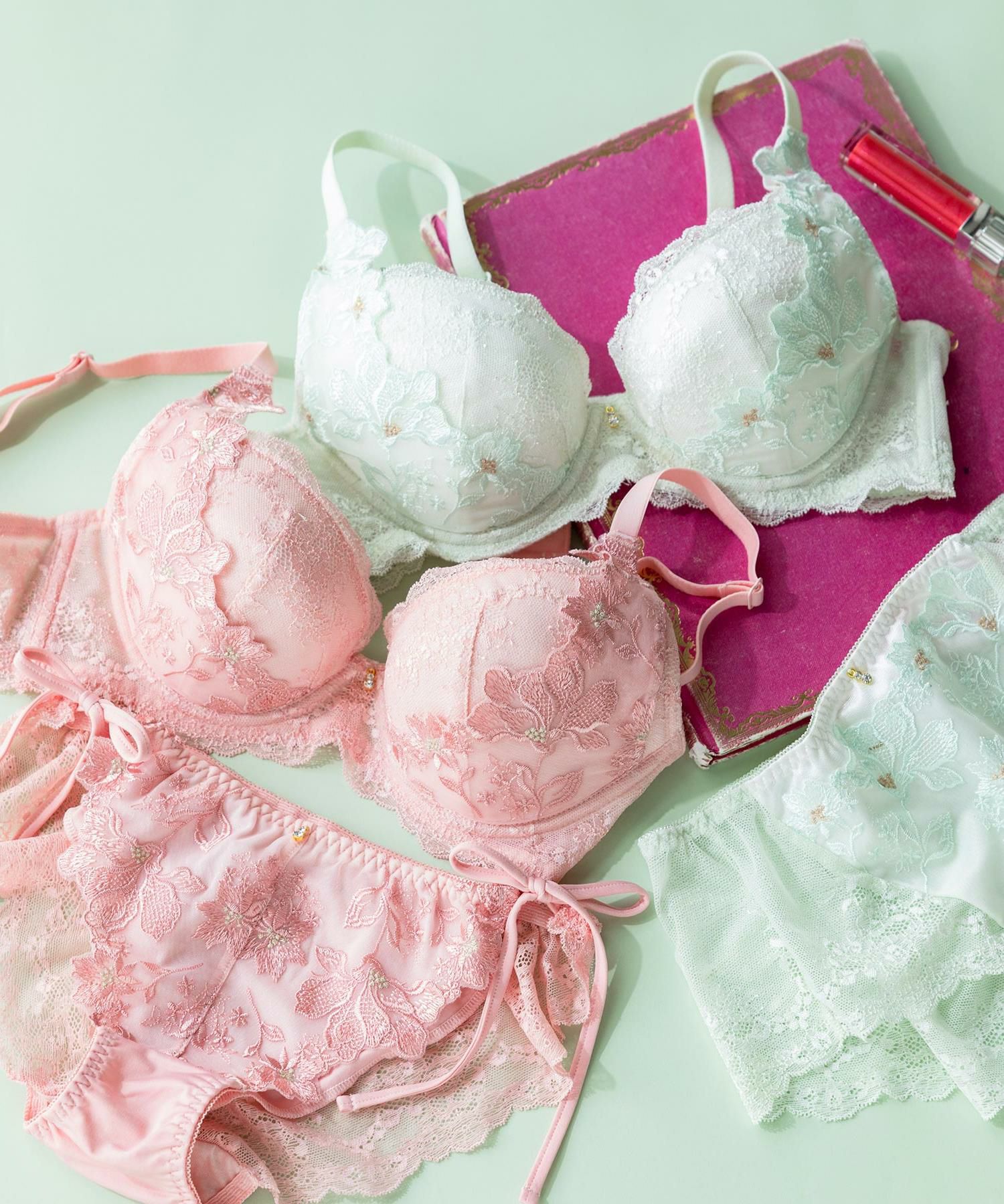 ストレッチレースにフラワー刺繍を重ねたフェミニンなデザインのシリーズ。