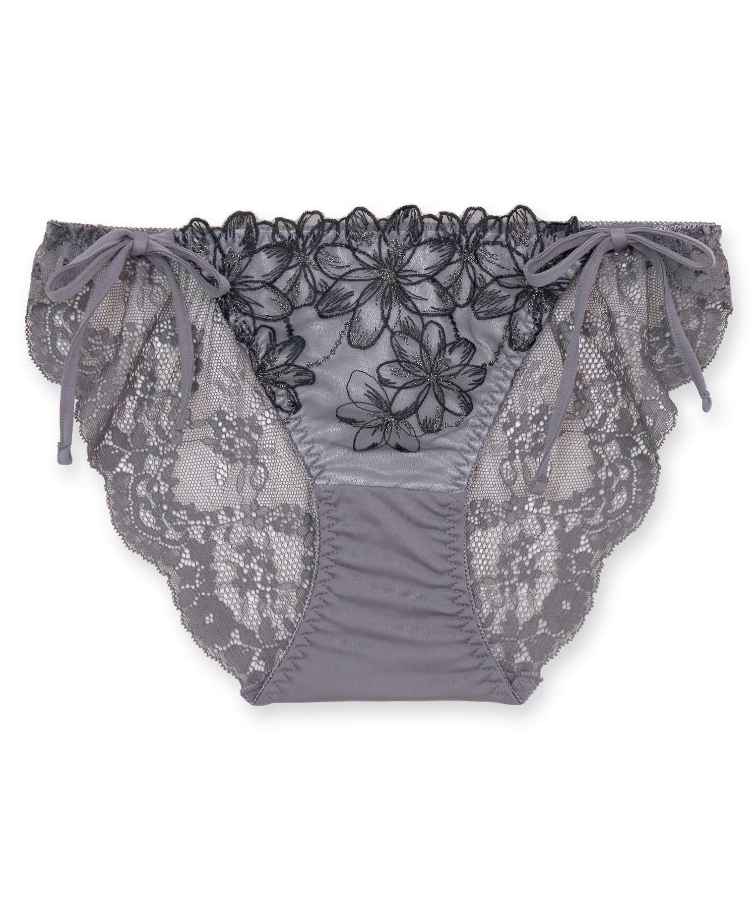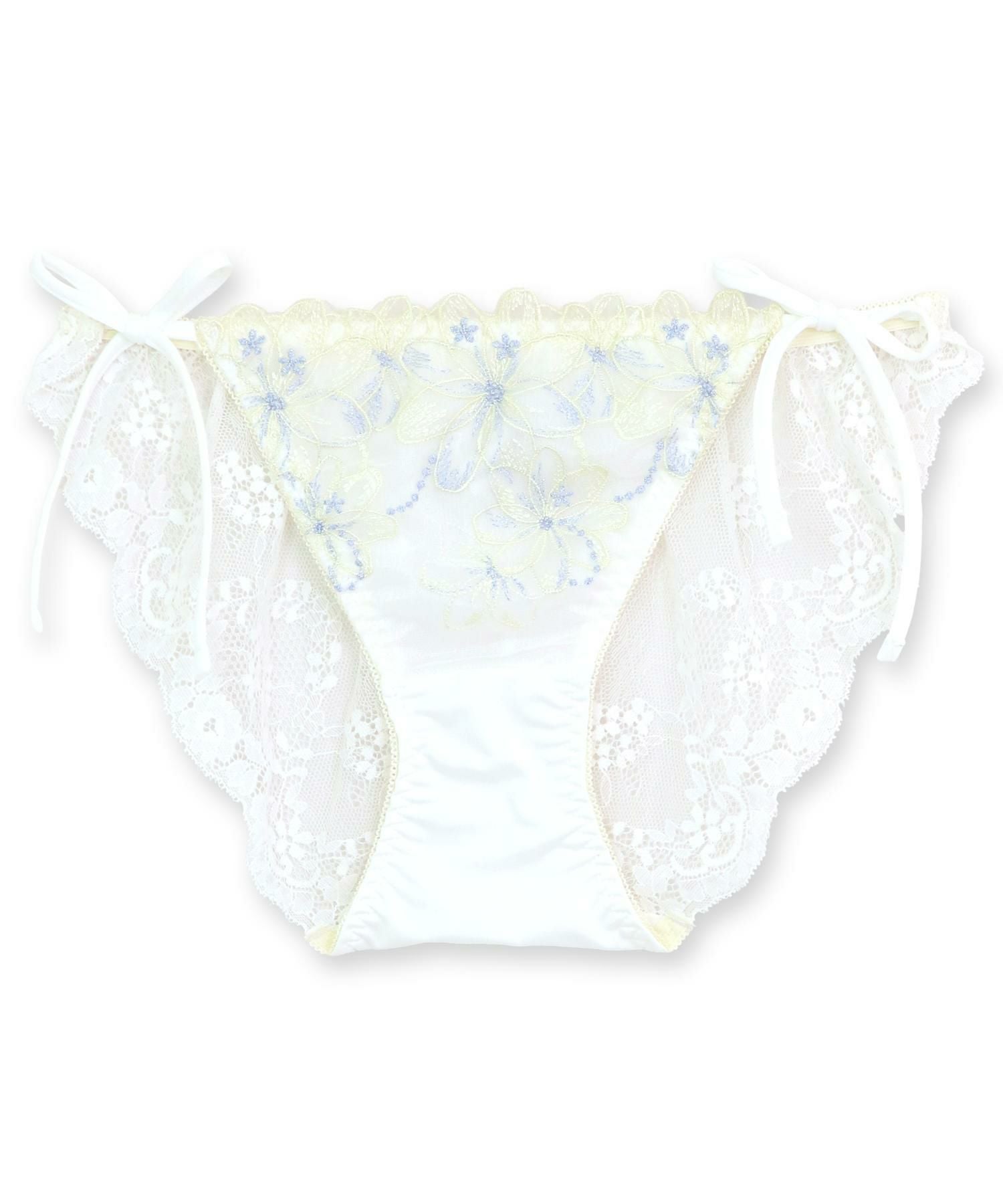マーガレットをモチーフにしたフラワー刺繍レースの紐&バックレースショーツ。きらめくラメ刺繍がいつもの日々をちょっとだけ特別なものにしてくれます。