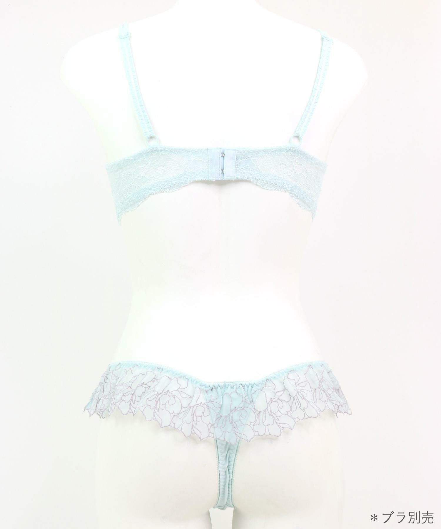 刺繍のチュールレースをたっぷり使ったフリルがウェストを一周するリュクスなデザインのTバックショーツ。ヒップラインを綺麗に見せるおしゃれアイテムの必需品。