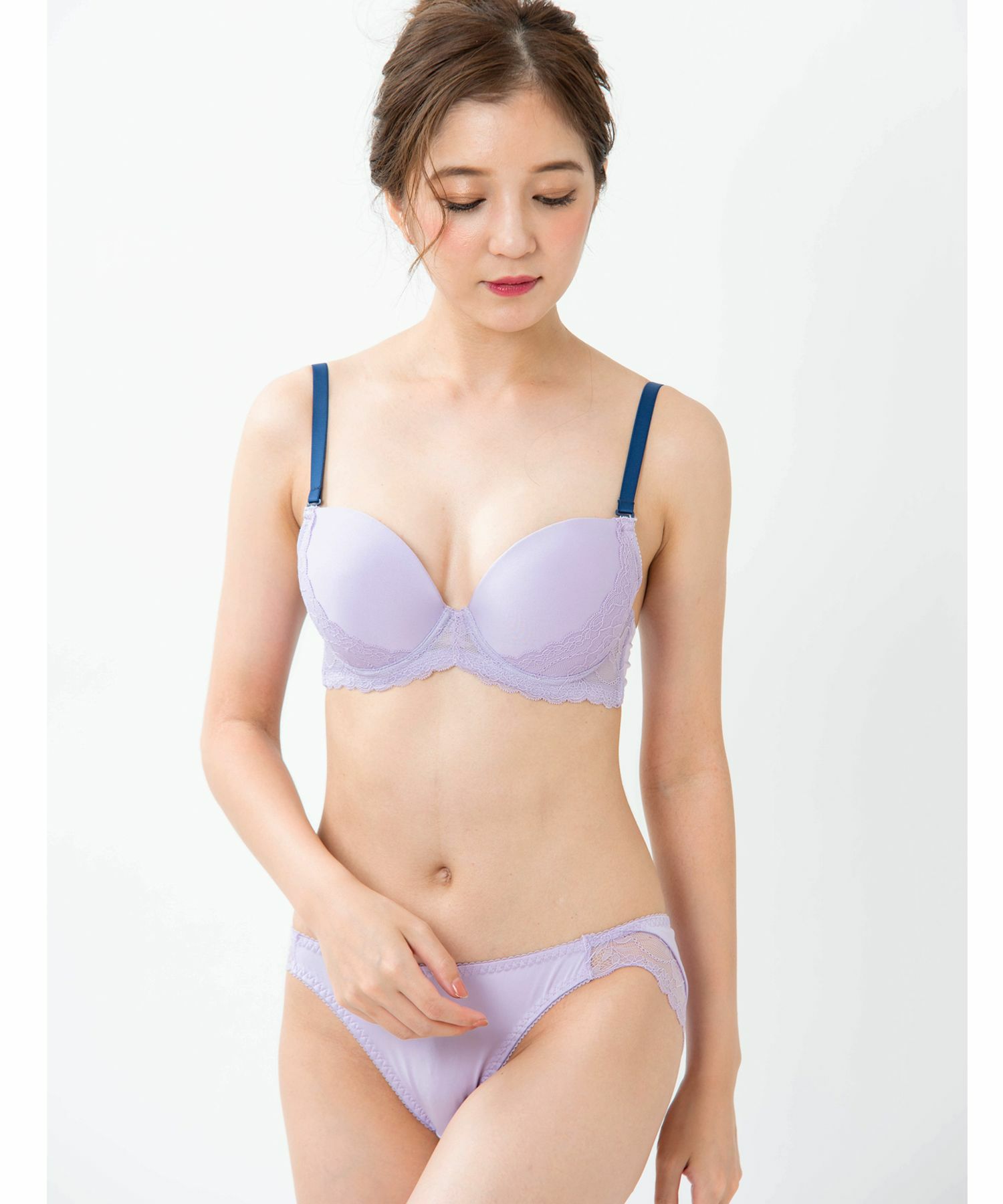 シンプルなつるんとしたモールドカップの一部にだけレースを重ねたベーシックなデザイン。お揃いのショーツのバリエーションも豊富でライフスタイルに寄り添ってくれます。