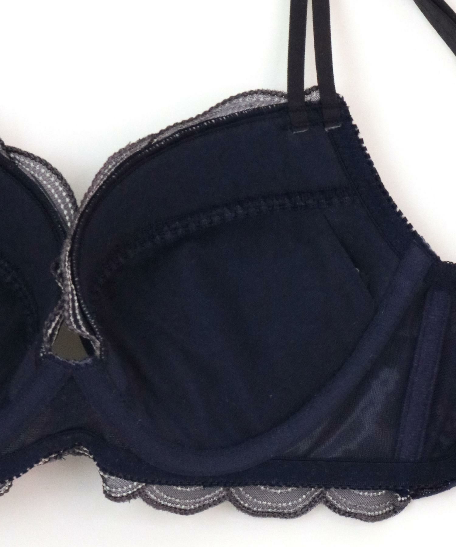 自然なバストラインで、サイドのボリュームはきちんと抑えてくれるブラパターン。ブラ自体の軽さも魅力。セットのショーツはデザイン性も響きにくい実用性も○のバックレースタイプ。